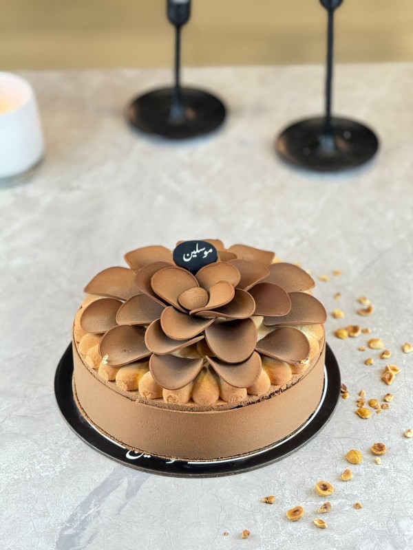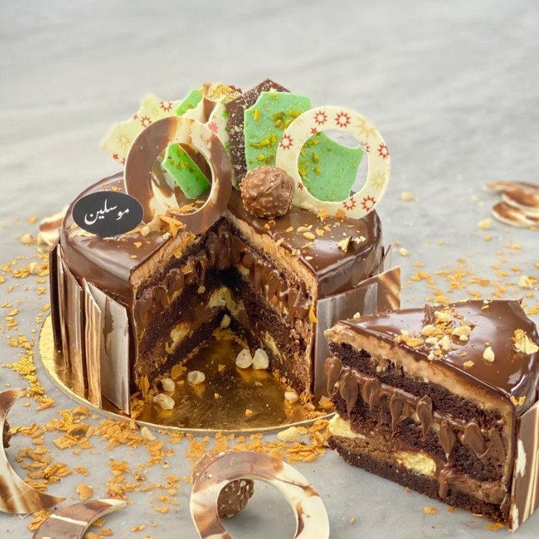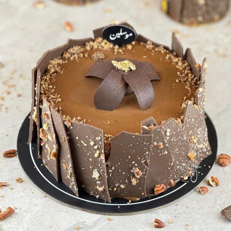4-6 أشخاص - طبقات من الشوكولاتة الداكنة وشوكولاتة الحليب مع حشوة كريمة الفانيليا والكراميل مغطاة ببالبندق المحمص وقطع الشوكولاتة الفاخرة