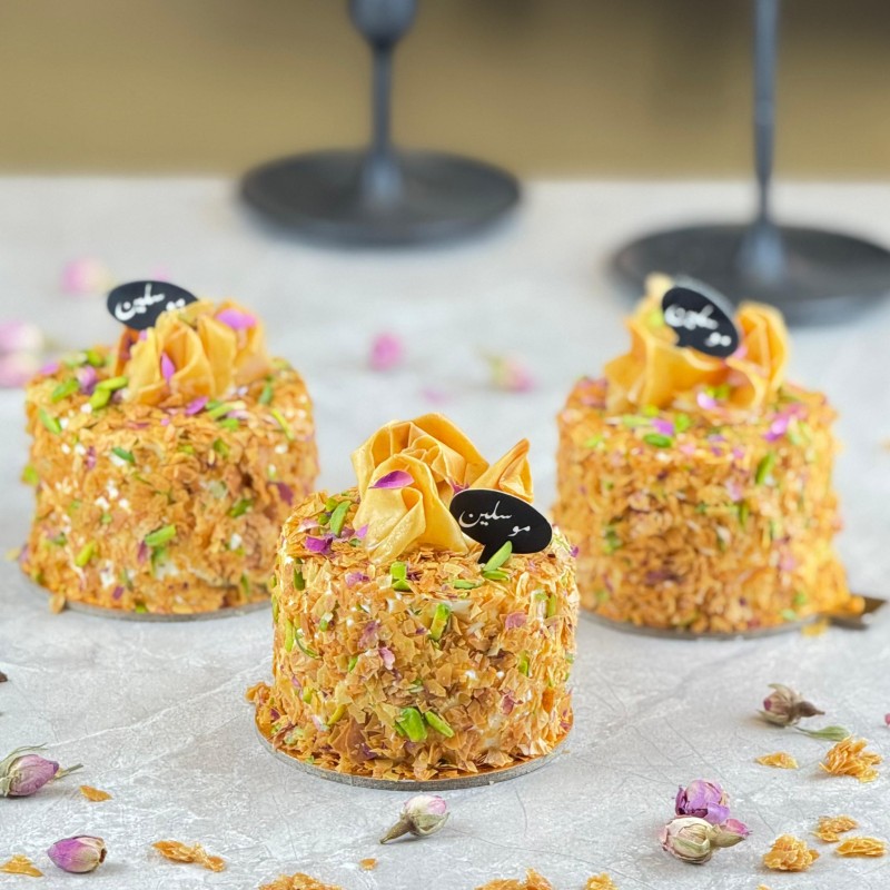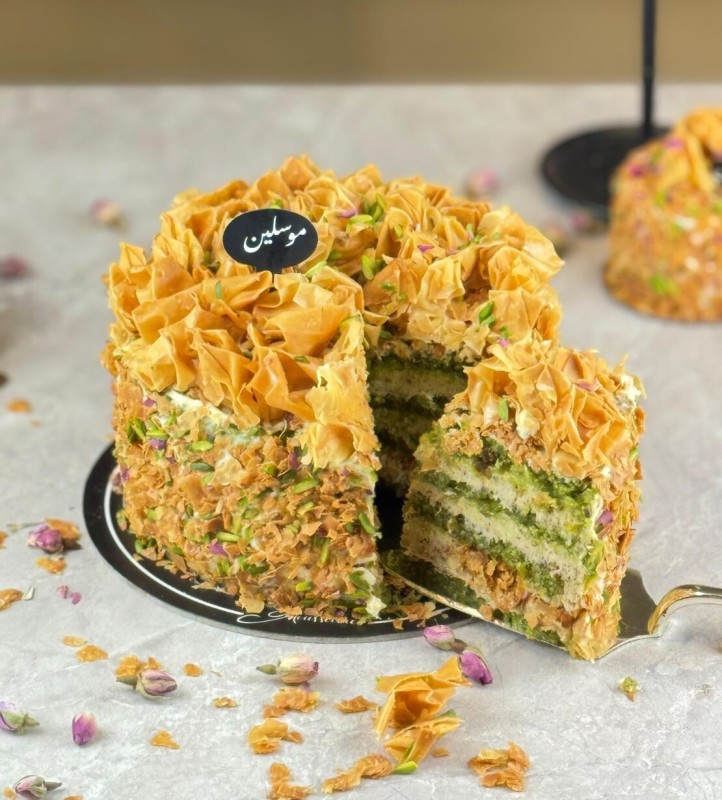 حبة عدد 1 - 8 سم-كيكة مكونة من طبقات الفستق والجبن مع البسبوسة مزينة بشرائح الفستق بقلاوة مخبوزة وورد مجفف