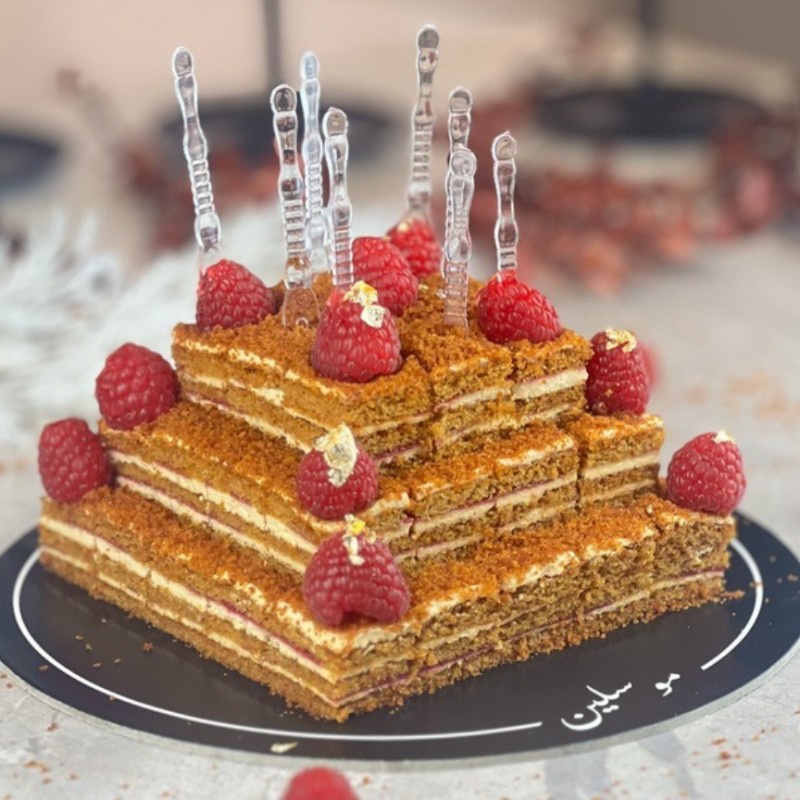 10-12 أشخاص - كيكة عسل إسفنجية مع كريمة العسل مزينة بتوت العليق ورقائق باللون الذهبي