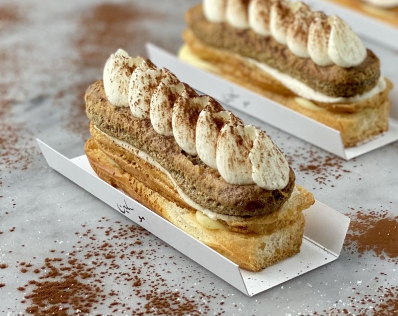 12 سم-إكلير محشو بالكاسترد وكريمة الفانيليا بنكهة القهوة وقطع بسكويت خاصة مغطاة بالكاكاو