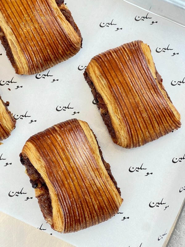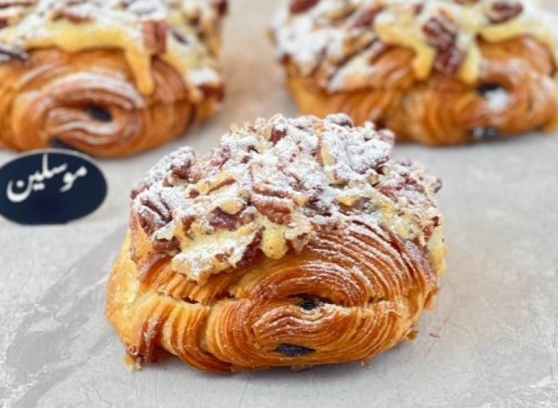 كرواسون غني بالكراميل والبيكان بالشوكولا الفاخرة والمغطى باللوز والسكر الناعم
