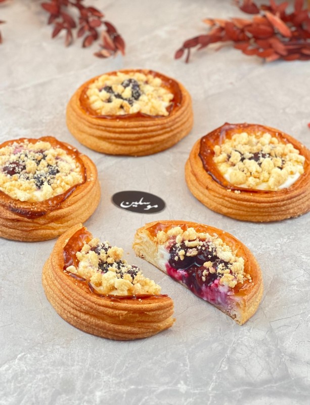 حبة عدد 1 - 8 سم-ميلفيه مقرمشة بالكاسترد ومزينة بأنواع من التوت الطازج والتين والفراولة