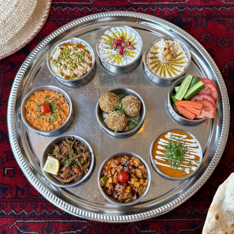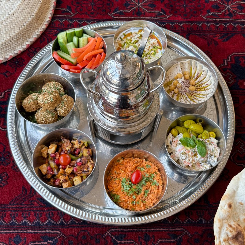 تشكيلة من : كبده وشكشوكة وفول وحمسة حلوم باذنجان وحمص بيروتي ولبنه زعتر وحلاوة طحينية بالقشطة والمكسرات وخيار طماطم