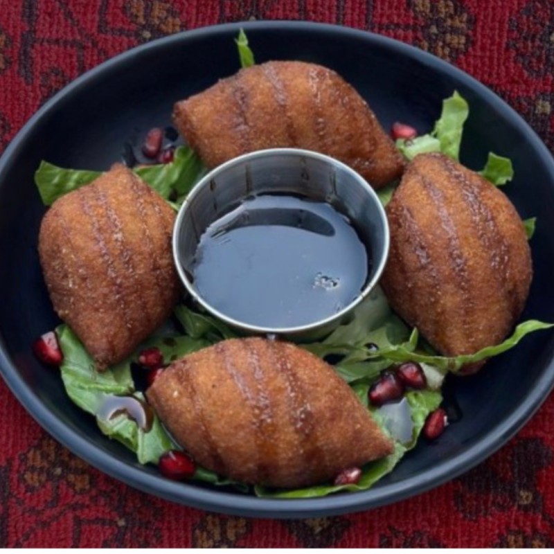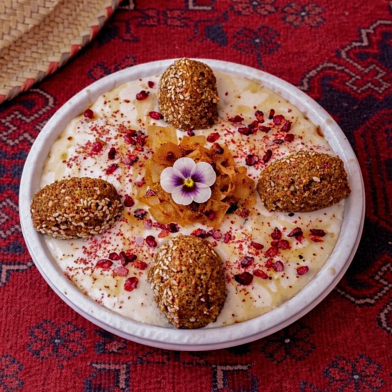 (645 سعرة حرارية)طبق شهي يتكون من الفلافل المقرمشة مع الخبز المحمص والصوص الخاص مع دبس الرمان اللذيذ