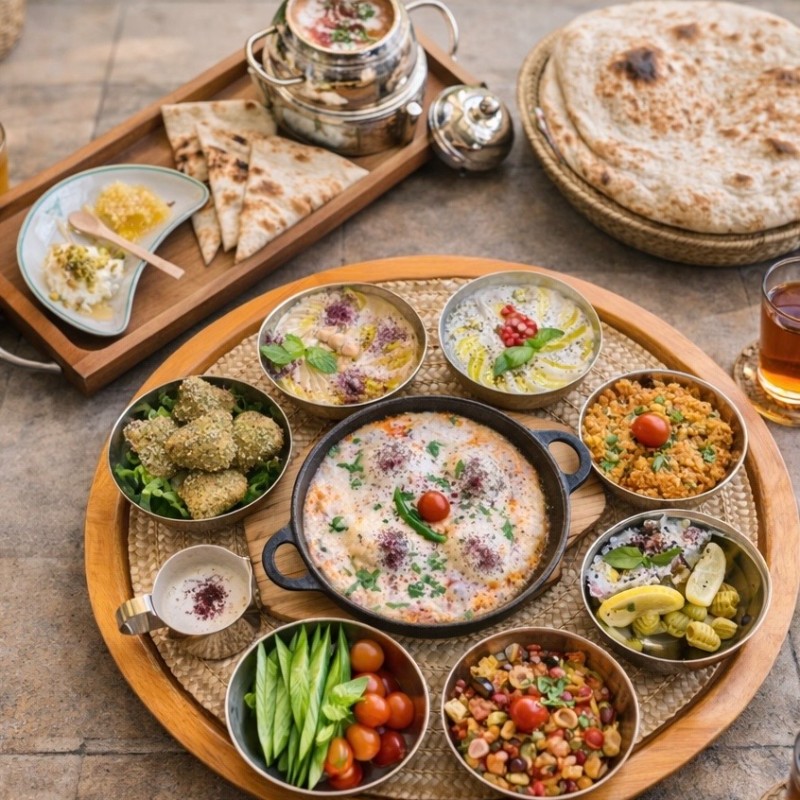 (1450 سعرة حرارية)تشكيلة فاخره من فول الفريج جرة وشكشوكه وفلافل وحمسة الحلوم بالباذنجان وزيتون مشوي بالجبن وحمص وحلاوة بالمكسرات وخيار وطماطم