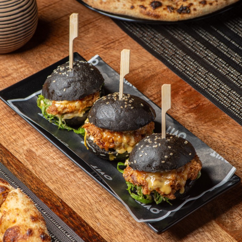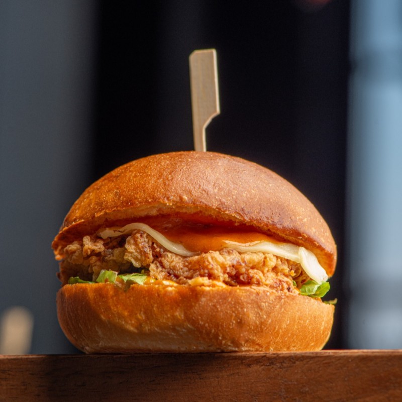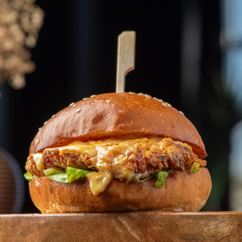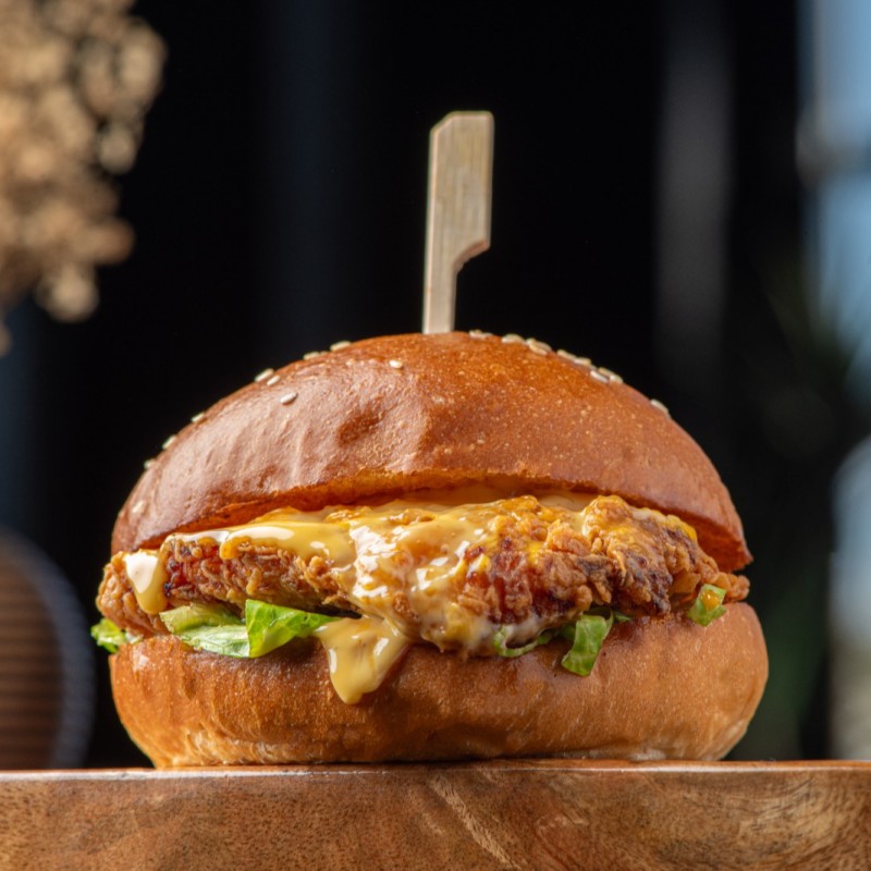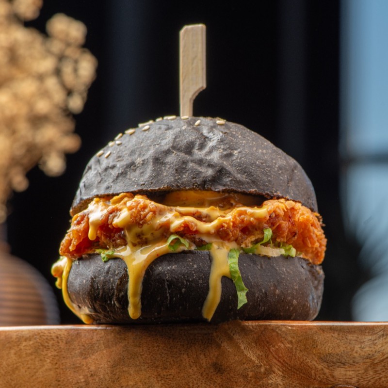 (690 سعرة حرارية)صدر دجاج مقلي سبايسي- صوص الشيدر - صوص سبايسي - خس - مخلل - خبز اسود مع السمسم