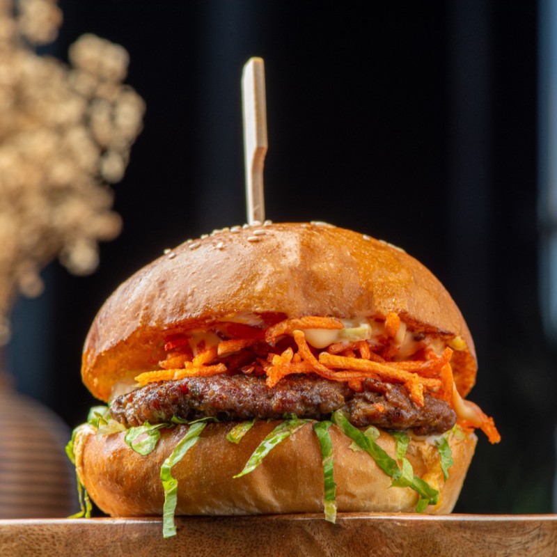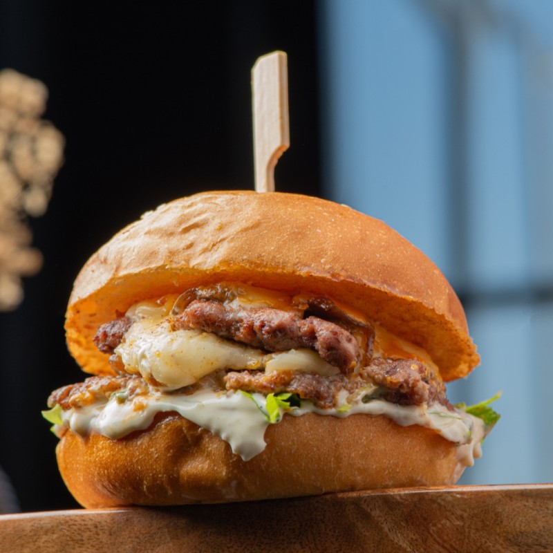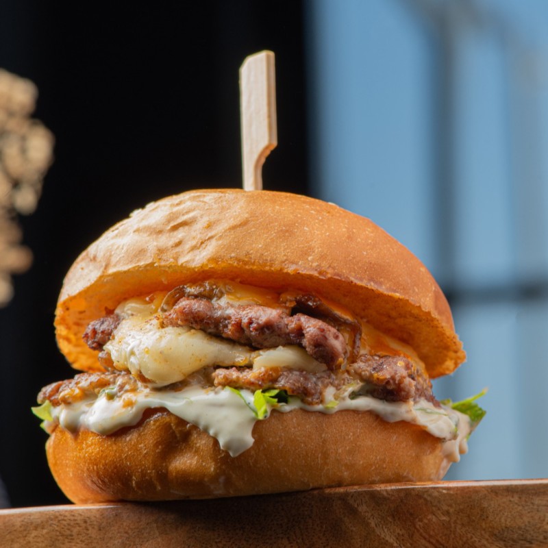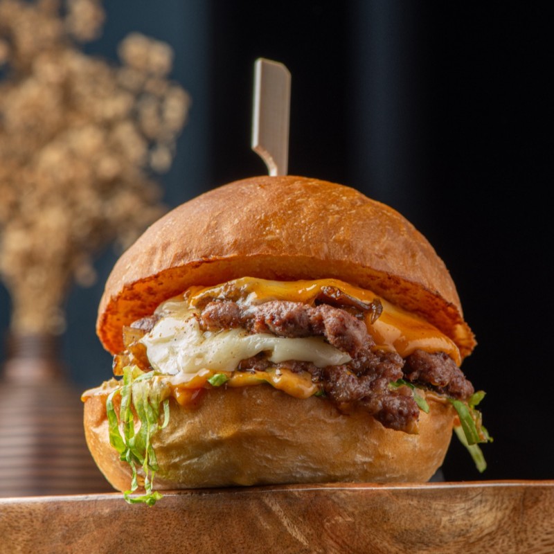 لحم بلاك انجوس دبل سماش ، خس ، شريحتين جبنه بيضاء مع الصوص الخاص ، خبز طازج بدون سمسم