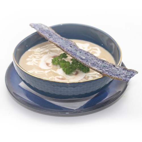 (174 سعرة حرارية)شوربة الفطر الطازج مع الكريمة ، البصل الأخضر، البطاطس ، الثوم ، الزبدة ، زيت الزيتون ، بورشيني إيطالي