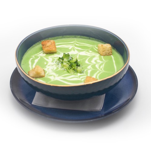(69 سعرة حرارية)شوربة البروكلي الطازجة مع الثوم ، البصل الأخضر، الكرافس ، مرق الدجاج ، الزبدة الكريمة مع الخبز المحمص ، جبنة البارميزان