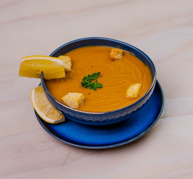 (185 سعرة حرارية)عدس احمرمطبوخ مع خضار مشكلة يقدم ساخنا مع لمسة من عصير الليمون والخبز المحمص