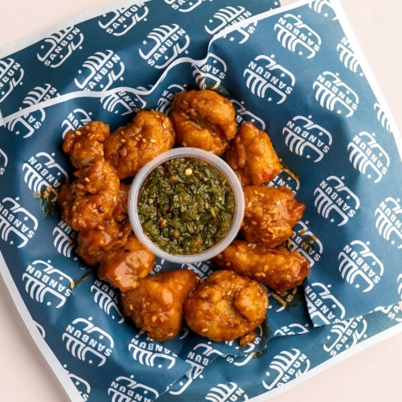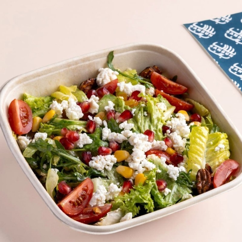(41 سعرة حرارية)خليط من الخس الأمريكي الطازج والجرجير، مع شرائح طماطم الشيري و الخيار، ممزوجة بالصوص الخاص مع إضافة الجوز المكرمل والمشمش المجفف والذرة الحلوة والرمان ويعلوه جبن التركي.