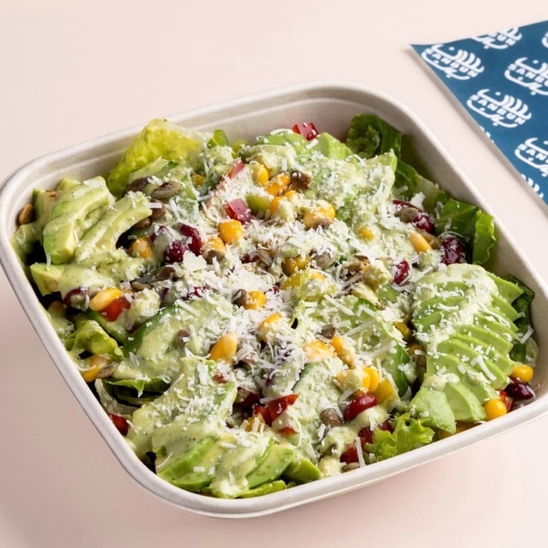 (70 سعرة حرارية)تجمع بين شرائح الأفوكادو الطازجة والخس الأمريكي ، مع شرائح طماطم الشيري والخيار. مع إضافة الفاصوليا الحمراء والذرة الحلوة، والبذور المقرمشة. يُزين الطبق بجبن البارميزان وتقدم مع الصوص الخاص