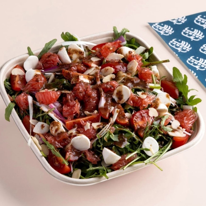 (32 سعرة حرارية)بيبي جرجير مع شرائح الجريب فروت والطماطم الشيري، يُخلط مع البصل الأخضر، ويُزين بجبن بيبي موزريلا وشرائح اللوز المقرمشة. باضافة صوص السلطة الخاص.