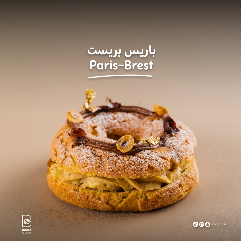 (350 سعرة حرارية)باريس بريست – حلى فرنسي كلاسيكي مصنوع من عجينة الشو محشوة بكريمة البندق الغنية، بطعم خفيف وهش