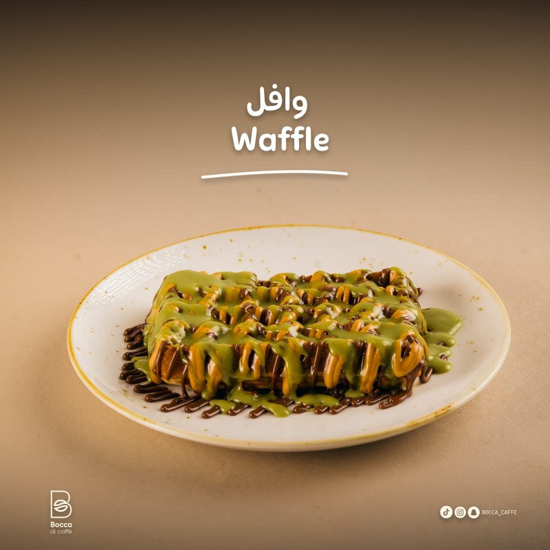 (291 سعرة حرارية)وافل بلجيكي يقدم مع مزيج النوتيلا واللوتس و البستاشيو وتزين بشرائح الموز والتفاح