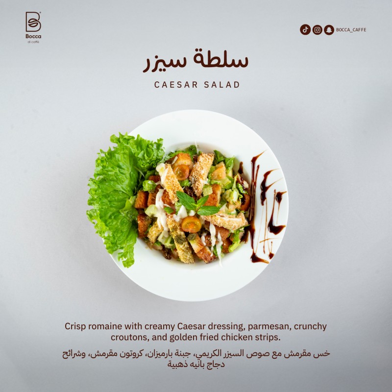 (650 سعرة حرارية)خس مقرمش مع صوص السيزر الكريمي، جبنة بارميزان، كروتون مقرمش، وشرائح دجاج بانيه ذهبية.