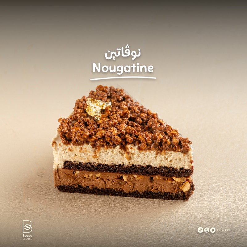 (320 سعرة حرارية)نوقاتين شوكولاتةسبنج شوكولاتة، موس شوكولاتة، موس بندق مع بندق ونوتيلا، مغطّى بنوقاتين بندق مقرمشة. 🍫
