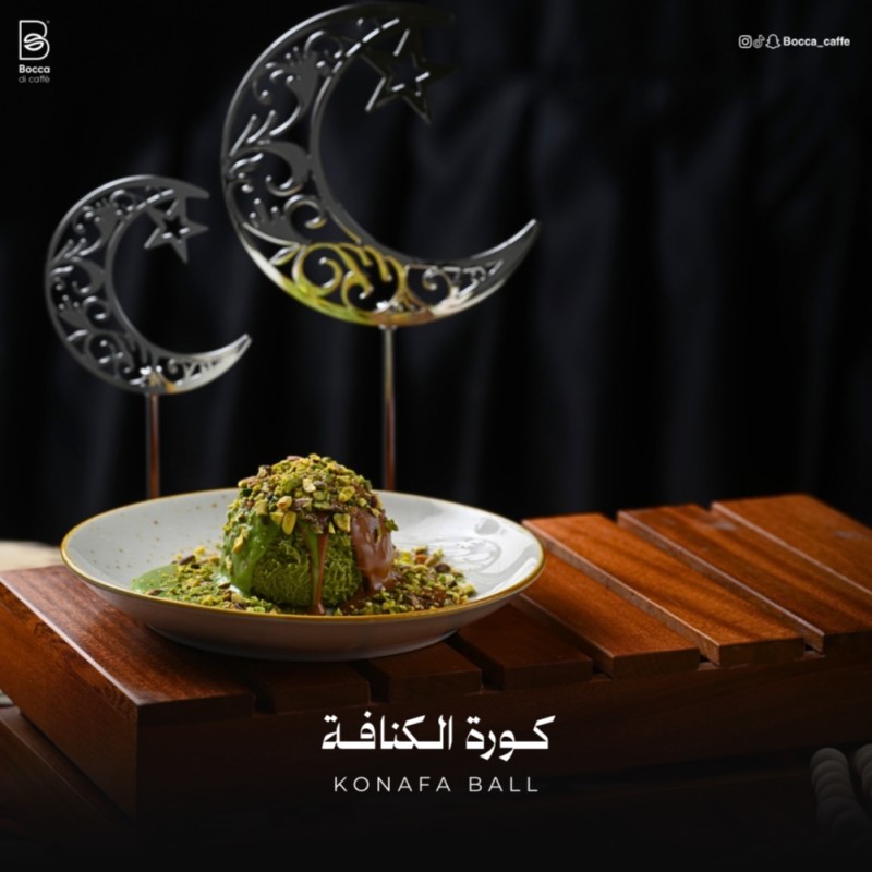 (340 سعرة حرارية)كرة كنافة بالفستق مغطاة بصلصة غنية، بتقديم أنيق ولمسة رمضانية فاخرة