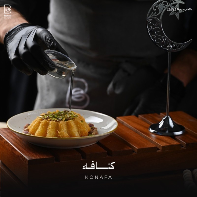 (320 سعرة حرارية)كنافة ذهبية ساخنة يُسكب عليها القطر، بلمسة تقديم فاخرة وأجواء رمضانية أنيقة.