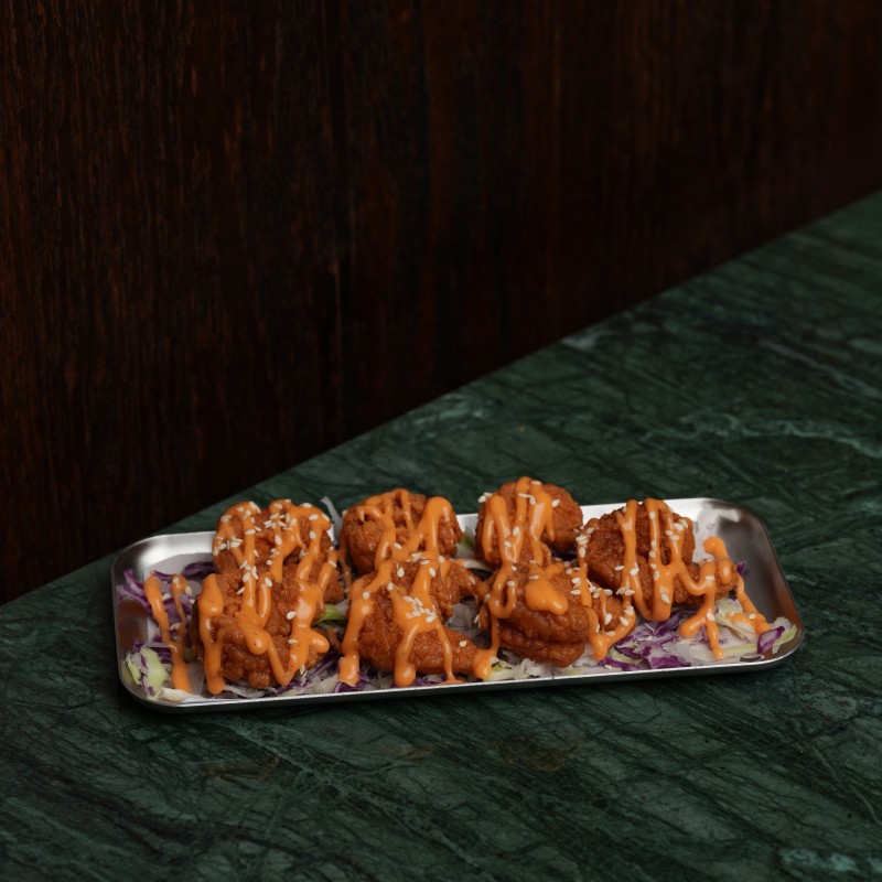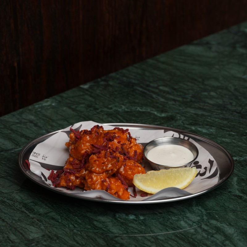 (420 سعرة حرارية)قطع الروبيان المقرمشة تقدم بصوص راش البارد او الحار مع سمسم ..
