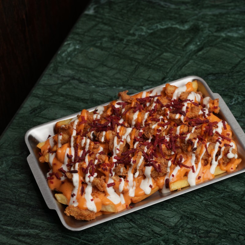 (1520 سعرة حرارية)البطاطس المقلية مع قطع الدجاج المقرمشة ورقائق البصل و الشمندر و نوعين من صوص الشيف..