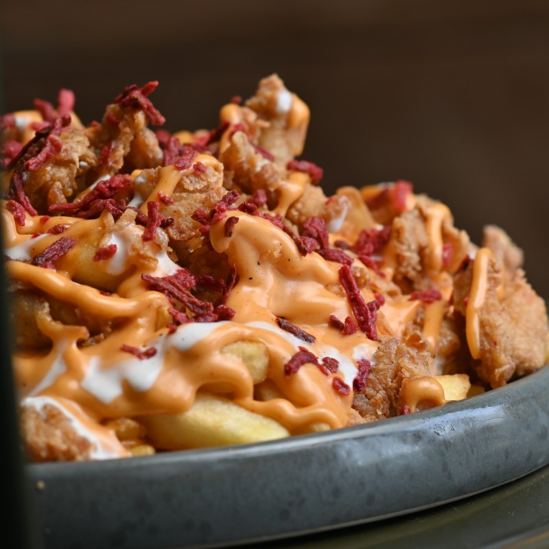 (1520 سعرة حرارية)البطاطس المقلية مع قطع الدجاج المقرمشة ورقائق البصل و الشمندر و نوعين من صوص الشيف..