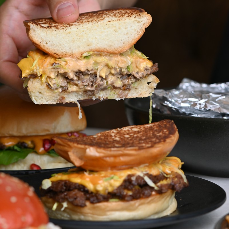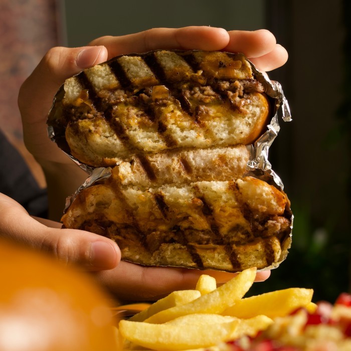 (1020 سعرة حرارية)خبز البريوش الطازج مع قطع لحم الطازجة مع صوص راش المميز بطريقة سماش المختلفة .