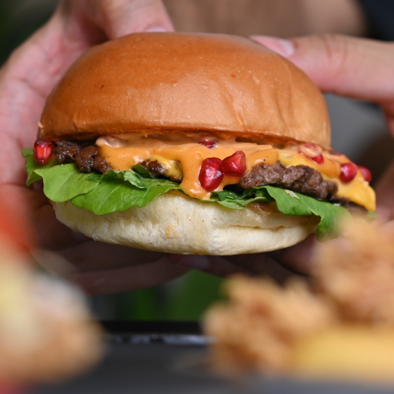 (684 سعرة حرارية)قطعة من لحم الفاخر بـ الخبز البريوش والجبنة الشهيه وحبات الرمان وبصل وشرائح الجرجير وصوص الشيف..