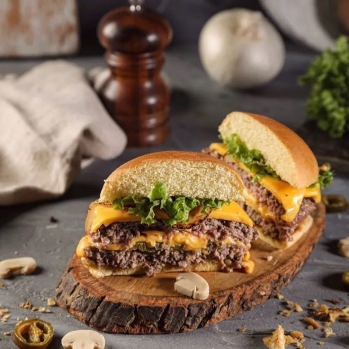قطعتين من لحم الجوسي مع شرايح الجبن شيدر الاصلية بـ صوص الخاص مع شرايح الخس بـ الخبز المحمص لذيذ بالزبدة.