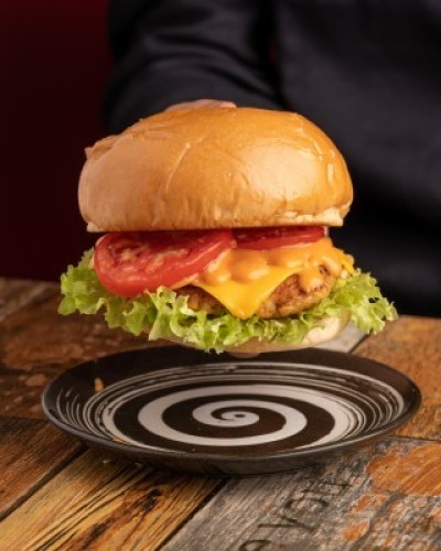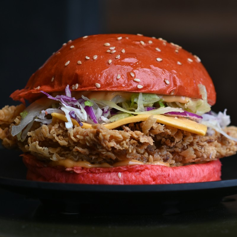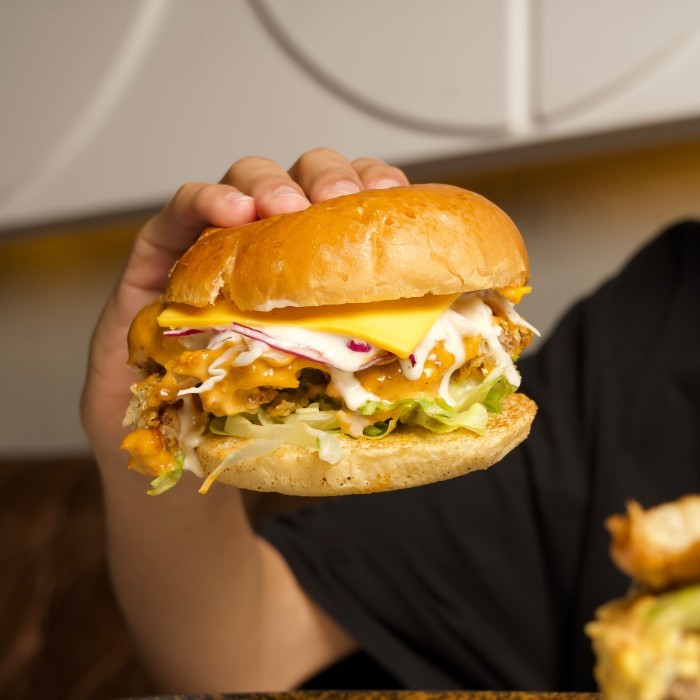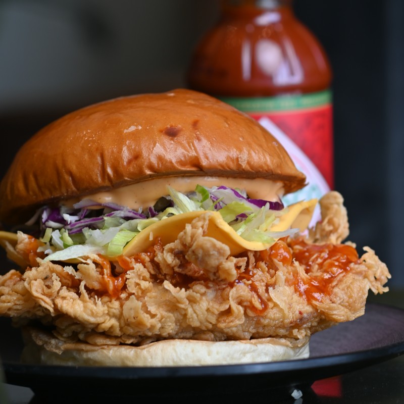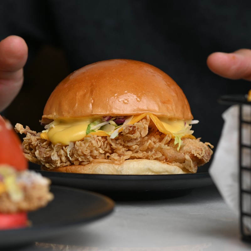 (495 سعرة حرارية)قطعة من دجاج مقرمش مغطا بصوص لذيذ بـ الخبز البريوش والجبنة الشهيه وسلطة ملفوف ..