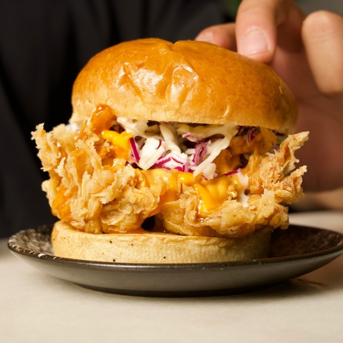 عبارة عن دجاج مقليه المقرمش بـ صوص هاني ماسترد مع مزيج من خس و ملفوف وصوص لذيذ بخبزة البربوش ..