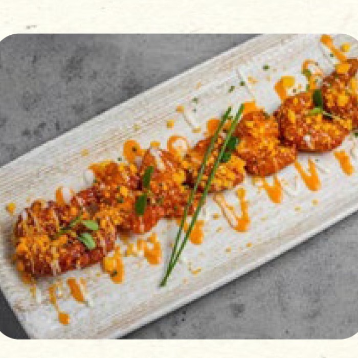 روبيان يُقدَّم مع صلصةٍ كريميَّة القوام، ويتمتَّع بطعم الروبيان الطَّازج المُعزَّزِ بطعم الصلصة المُضافِ إليها.