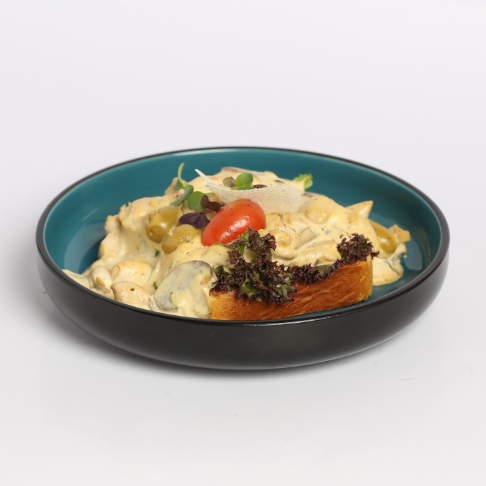 خبز البريوش وعليه قطع من الدجاج المشوي مع صوص المشروم.