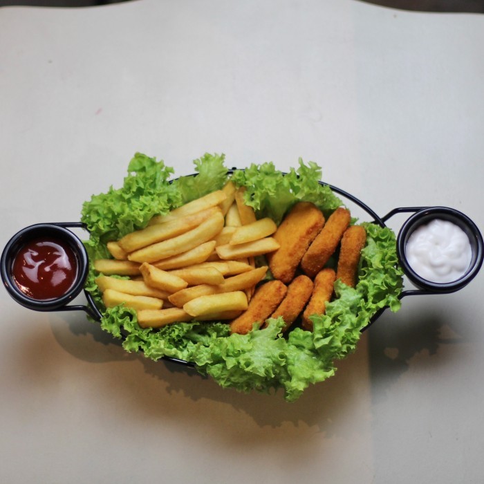 وجبة لذيذة مكونة من 6 قطع من صدور الدجاج مقرمشة و بطاطس و كاتشب وثوم