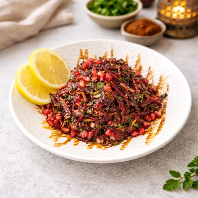 (97 سعرة حرارية)مزيج منعش من الشمندر و الجزر المبشور مع بقدونس طازج و بصل تتوازن نكهاتها بدبس الرمان و زيت الزيتون نكهه خفيفه لذيذه تجمع الحلاوه و الحموضه في طبق واحد .