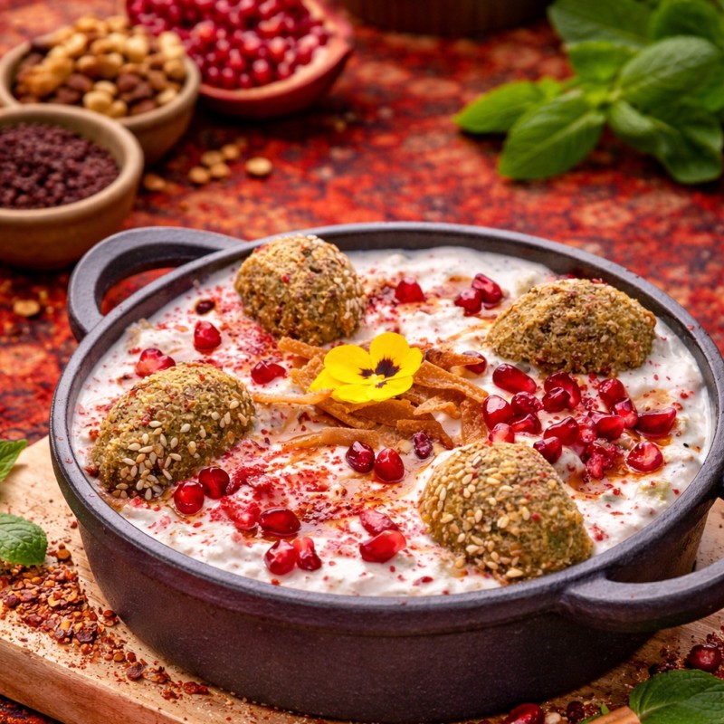طبق شهي يتكون من الفلافل المقرمشة مع الخبز المحمص والصوص الخاص مع دبس الرمان اللذيذ